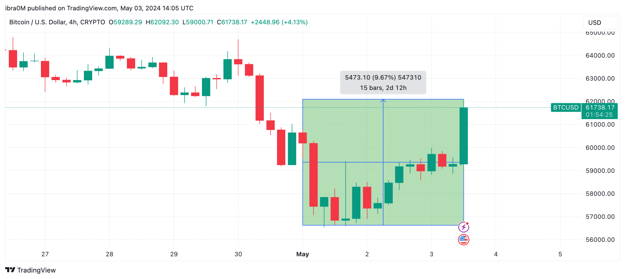 Bitcoin’s post-halving sell-off has stalled since the US Fed announced a rate pause on Wednesday, setting the stage for a mild price recovery phase. The markets witnessed further gains on Friday after the U.S. Bureau of Labor Statistics’ released Non-Farm jobs data for April 2024.