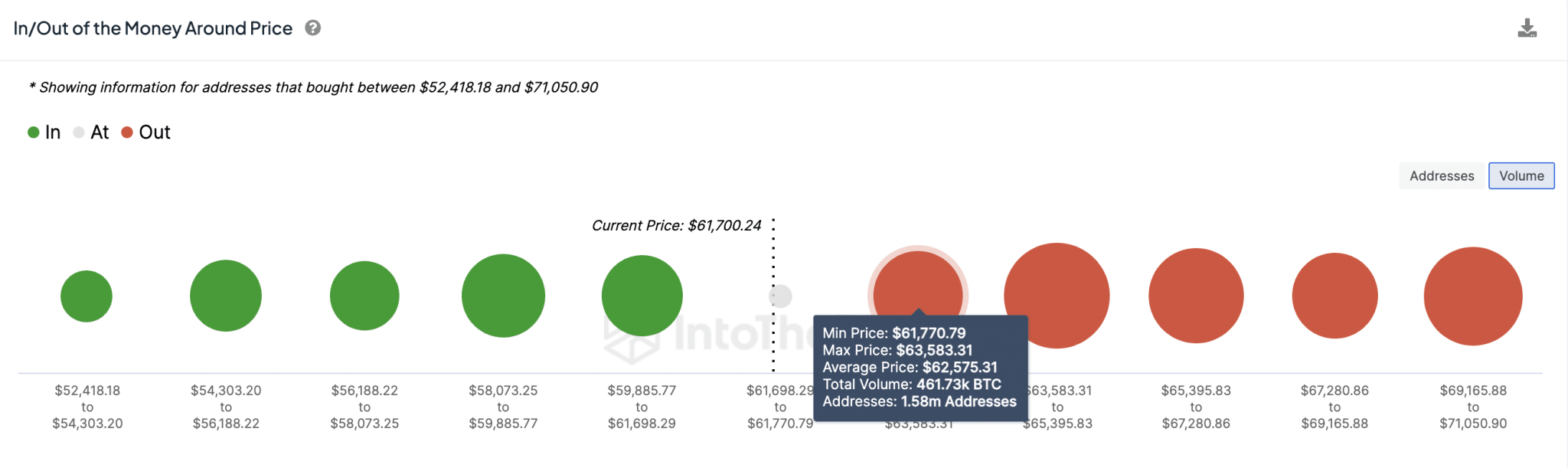 However, historical accumulation trends from IntoTheBlock’s in/out of the money chart also affirms this optimistic Bitcoin price forecast. It shows that the $61,770 – $63,583 area has been a major accumulation zone among existing BTC holders in the past.