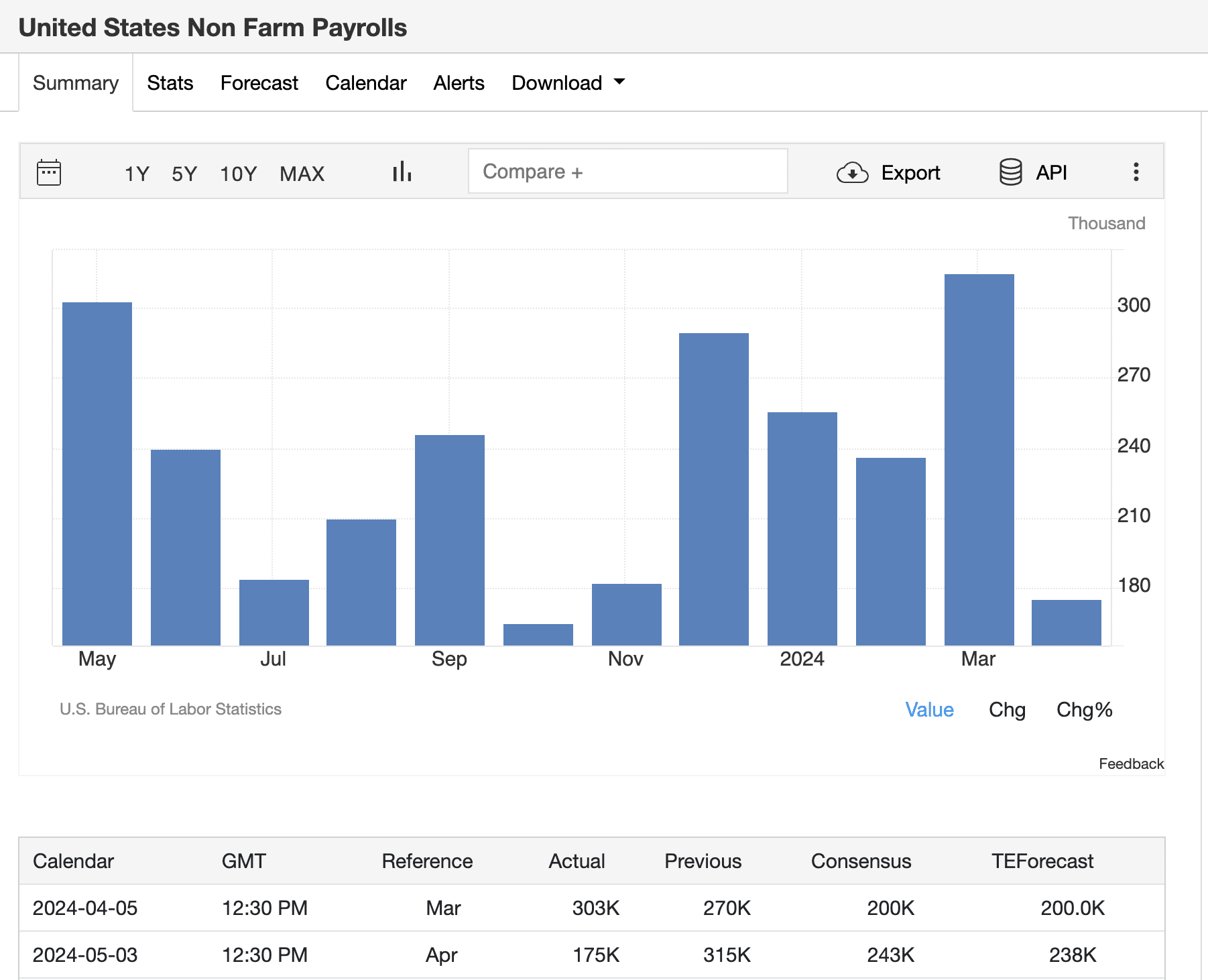 The US labor market added 175,000 non-farm jobs in April 2024, according to the Bureau of Labor Statistics’ latest data. This shows a month-on-month decline of 140,000 jobs, while also falling 28% short of the market’s consensus expectation of 243,000 jobs.