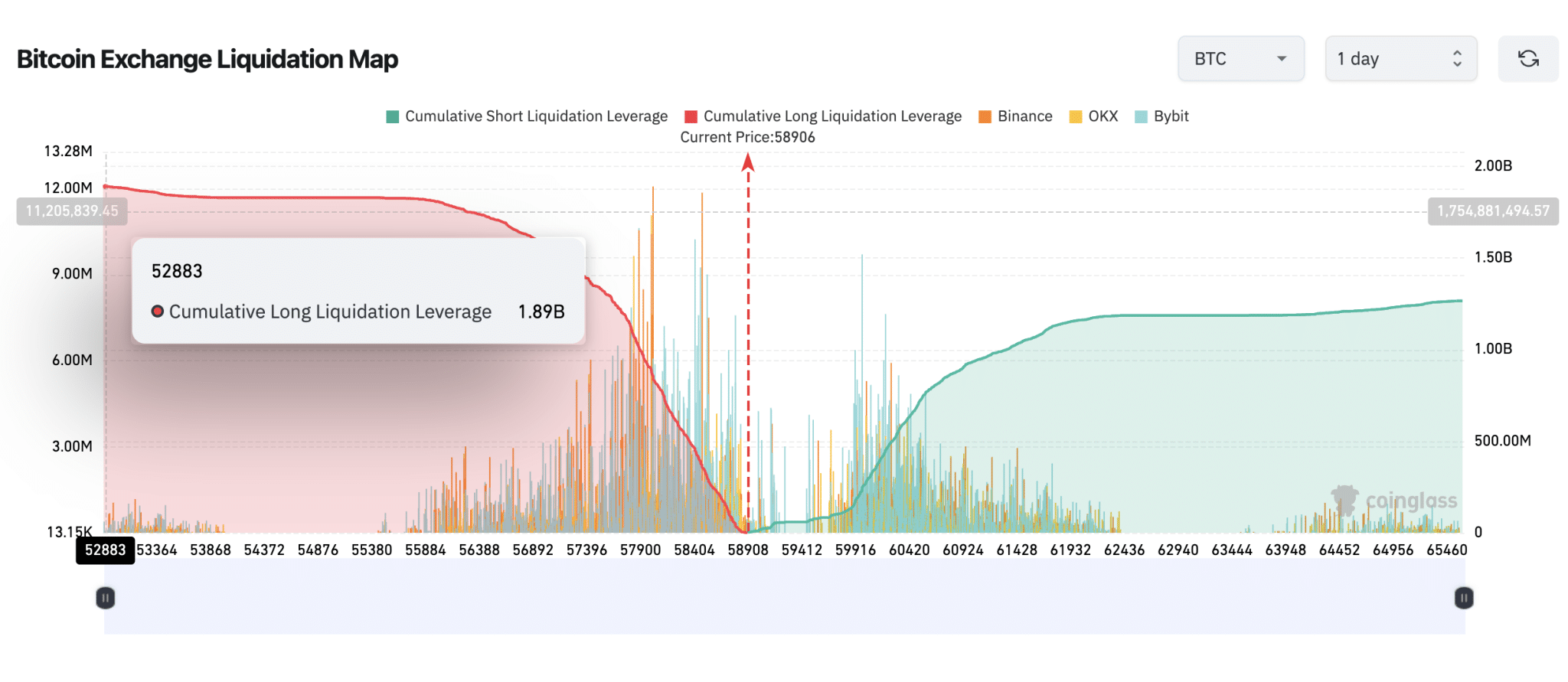 Coinglass’ liquidation map shows the amount of leverage that Bitcoin traders have applied on their existing speculative positions around the 10% boundaries of the current prices.