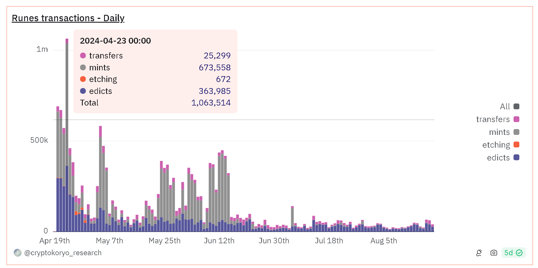 Over the past four months, Runes has outpaced BRC-20 in terms of daily transaction share on most days. As the chart below shows, BRC-20 has outpaced Runes in just 13 days. Of the 15.6 million Runes transactions, more than 9 million were mints, 6.5 million were decrees, and 91,500 were engravings.