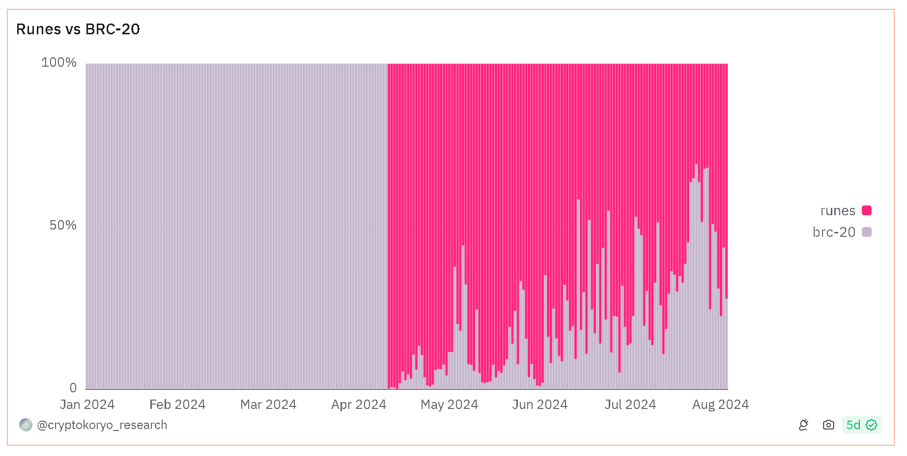 The Bitcoin Runes protocol initially dominated daily transactions post-launch, but is now declining as BTC regains network dominance. In the two months since July 16, the original Bitcoin has consistently covered about 90% of the network, while the remaining 10% is shared between Ordinal BRC-20 and Runes.