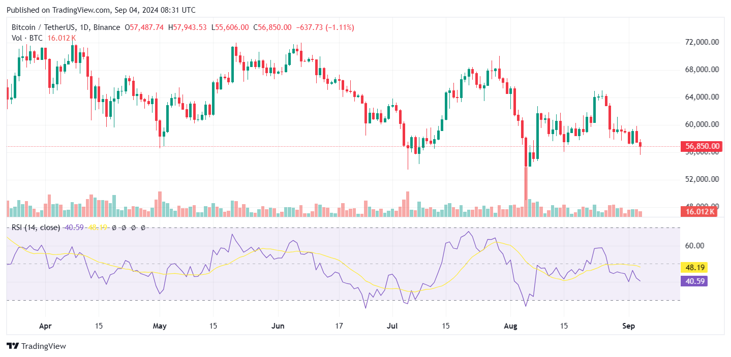 Bitcoin (BTC), the world’s leading cryptocurrency, experienced a significant decline in the past 24 hours, dropping 4.09% to $56,586 from a recent high of $61,000. This sharp downturn has reignited concerns of a potential bear market among investors.