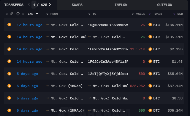 Arkham Intelligence’s analysis revealed that a prominent wallet address labeled “1FG2C…Rveoy,” moved 30,371 BTC, while an additional 2,000 BTC initially went to a Mt. Gox cold wallet before being moved to a different, unmarked address.