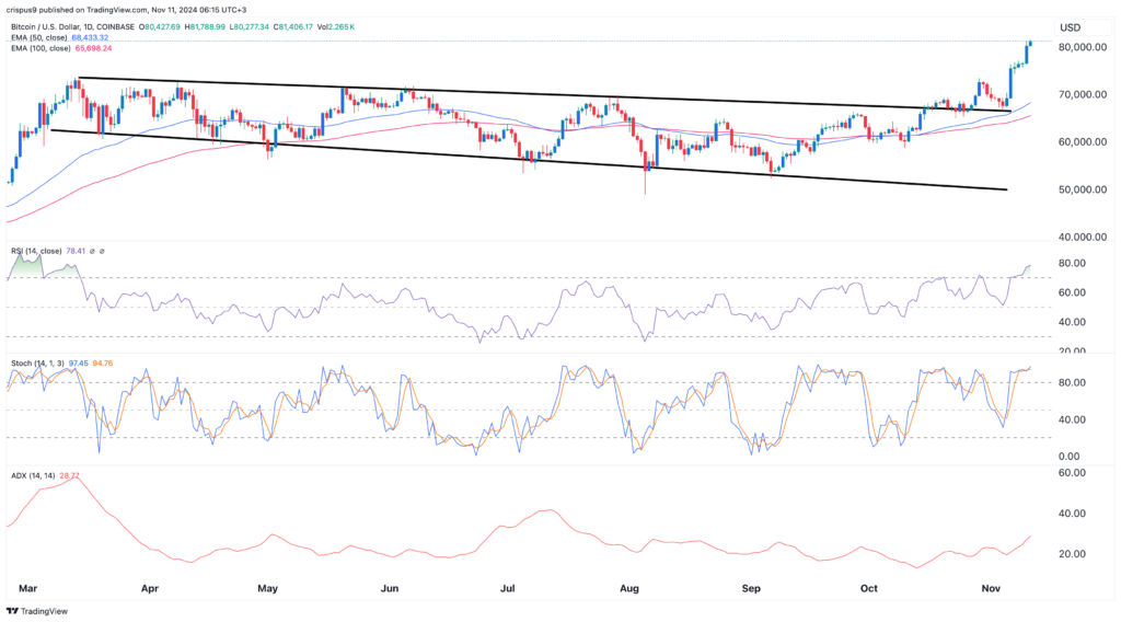 The daily chart shows that the price of Bitcoin has done well in the past few weeks. It has surged to a record high of over $81,400, and moved above the upper side of the falling broadening wedge pattern.