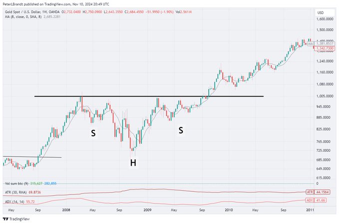 This is called a complex continuation inverted H&S pattern – I know that’s a mouth full Lots of chartists deny its existence – not me Also not Schabacker, Edward and Magee – check for yourself Note the similarities to Gold in 2009-2010 Complex shoulders, stunted RS $BTC$XAUUSD