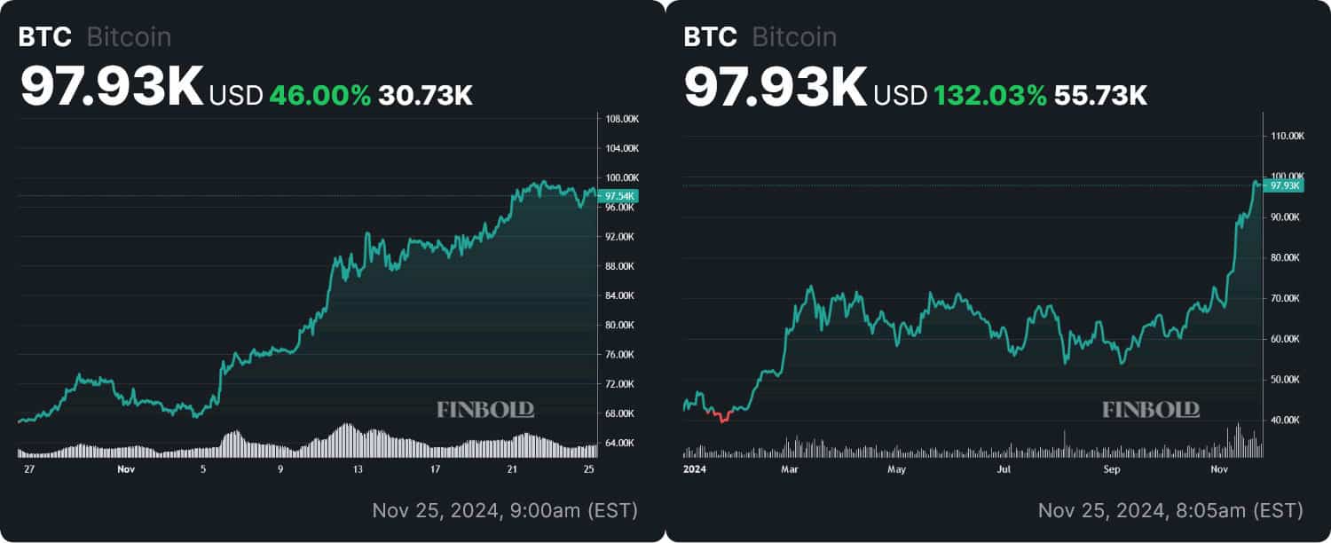 Saylor and MicroStrategy keep doubling down and purchasing BTC regardless of market conditions — but for now, it obviously seems to be working, as the accumulation strategy is outpacing even the most fervent miners — more to the point, it’s actually outperforming BTC itself. At press time, one Bitcoin was worth $97,930,000 — after a 46% rally on the monthly chart that has brought YTD gains up to 132.03%.
