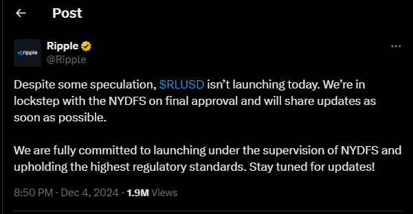 In the post, Ripple stated it is focused on launching RLUSD under the oversight of NYDFS and will maintain the “highest regulatory standards.”