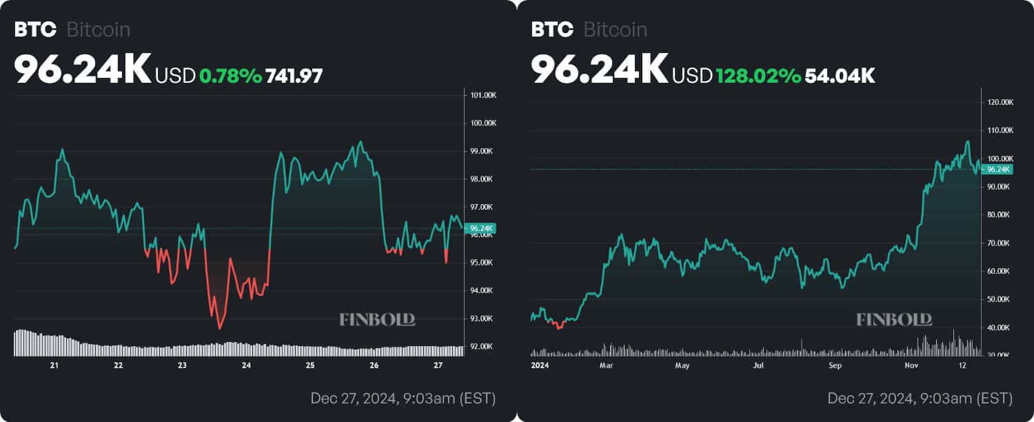 Things have improved somewhat since then — BTC has not reclaimed the $100,000 mark as of press time, but it has retraced back to approximately $96,240. Over the course of the last 7 trading days, Bitcoin has seen prices increase by just 0.78% — with year-to-date (YTD) returns standing at 128.02%.