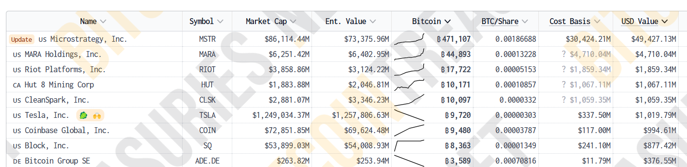 According to Bitcoin Treasuries, Tesla holds 9,720 BTC, making it the sixth-largest publicly traded company holding Bitcoin.