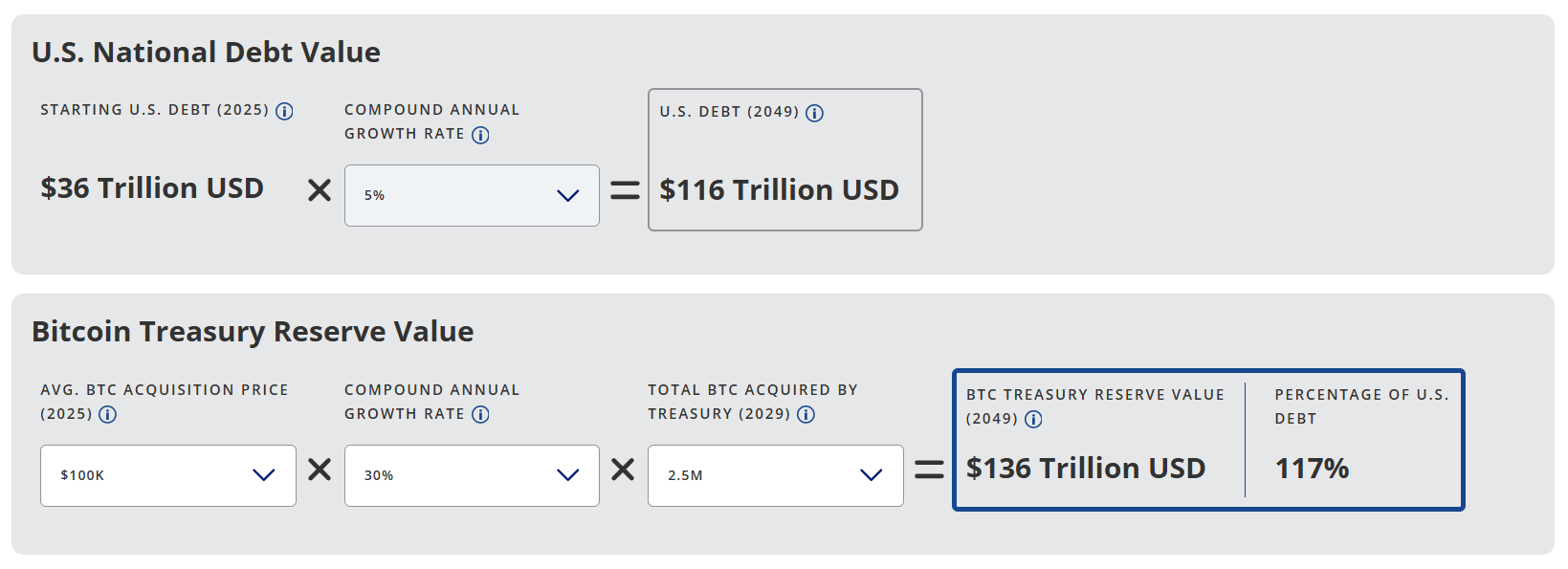 By 2049, the projected value of the Treasury’s Bitcoin reserve would be $136 trillion, exceeding the projected national debt of $116 trillion. This means the Bitcoin reserve could potentially cover 117% of the national debt, effectively wiping it out.