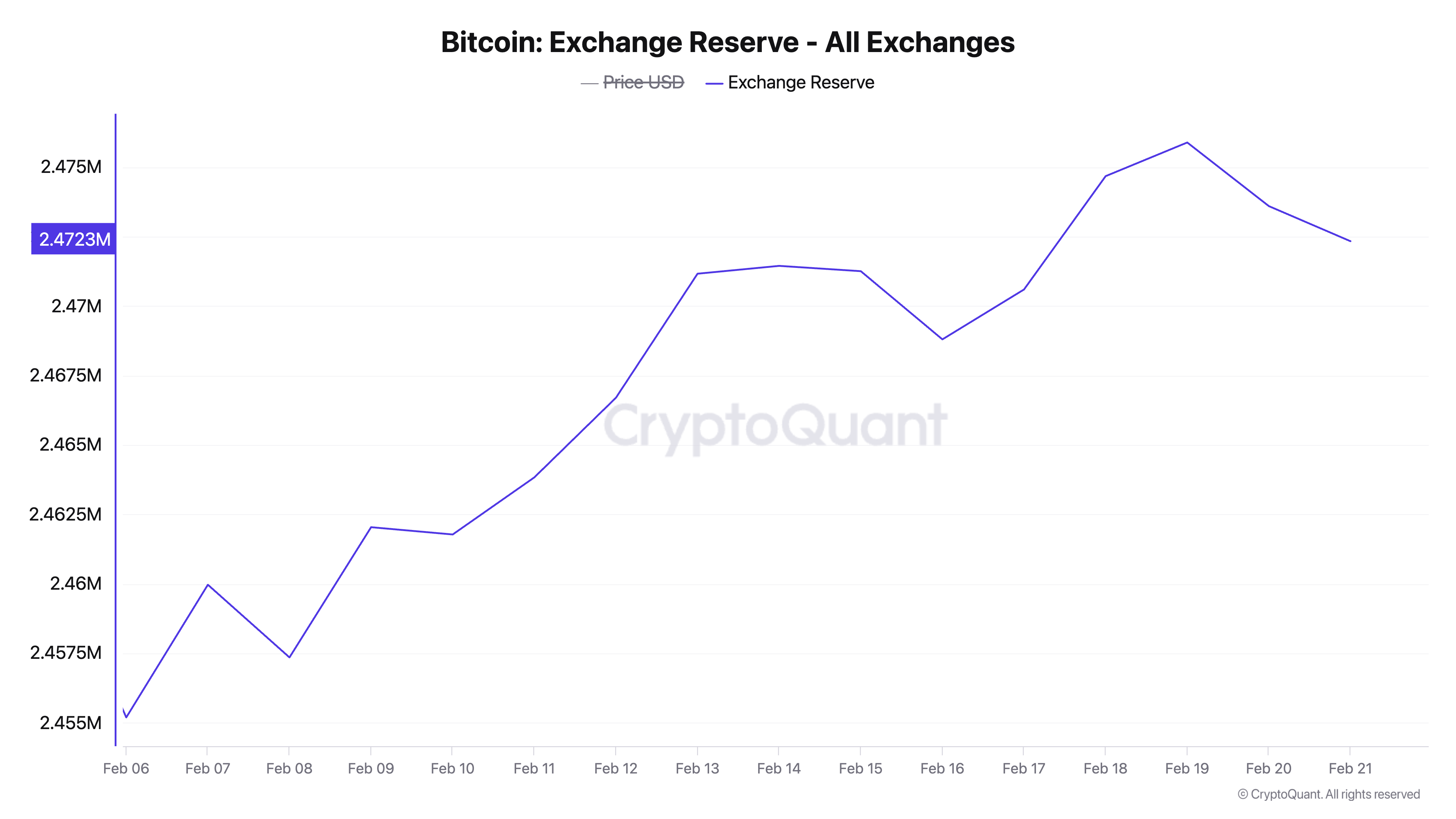Data from CryptoQuant shows a steady uptick in BTC’s exchange reserve since February 6. As of this writing, 2.47 million BTC are held in exchange wallets, noting a 1% surge since the beginning of the month.