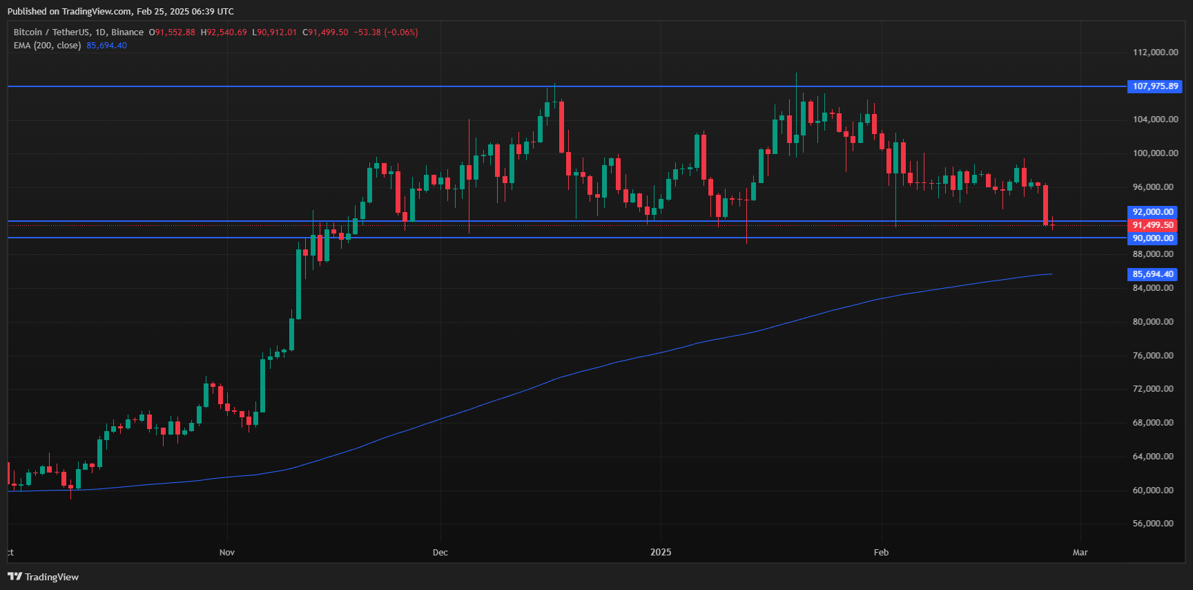 Based on my technical analysis, Bitcoin is currently testing the lower boundary of a three-month consolidation range, which lies between $92,000 and $90,000. The last interaction with this level in early February did not lead to a significant upward correction, and the upper boundary of the range was last tested in mid-January.