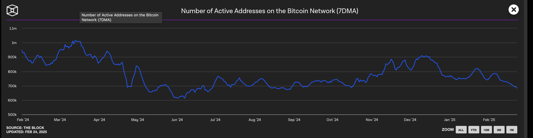 Along with the declining number of new users, the number of active users on the Bitcoin network has reached a significant low. Currently, it is down at 681.62K active addresses, marking the lowest since October 18, 2024.
