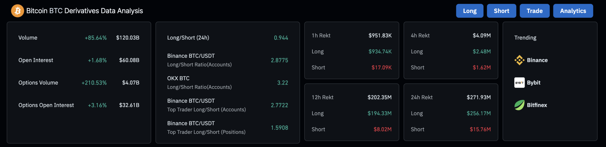 Currently, Bitcoin’s open interest remains at nearly $60.05 billion, highlighting strong sentiment. Overall, the long-to-short ratio based on all exchanges remains at 0.944, while the options volume has risen to $4.07 billion. Bitcoin’s option open interest has risen by 3.16% to $32.60 billion.