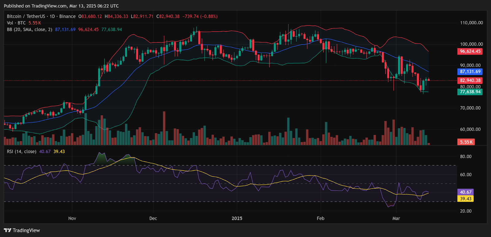 At press time, BTC trades at $82,963.17, a 2% increase in the past day. The Relative Strength Index (RSI) sits at 40.67, suggesting Bitcoin is near oversold territory, but not yet signaling a strong reversal.
