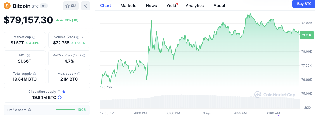 The rally saw Bitcoin briefly surpass $80,000 during overnight trading before stabilizing in the lower $79,000 range. The price has been rising gradually, starting from $75,490, and is backed by high market demand. The amount of bitcoins in circulation is currently 19.84 million out of 21 million. That brings the fully diluted market value of the network to $1.66 trillion.