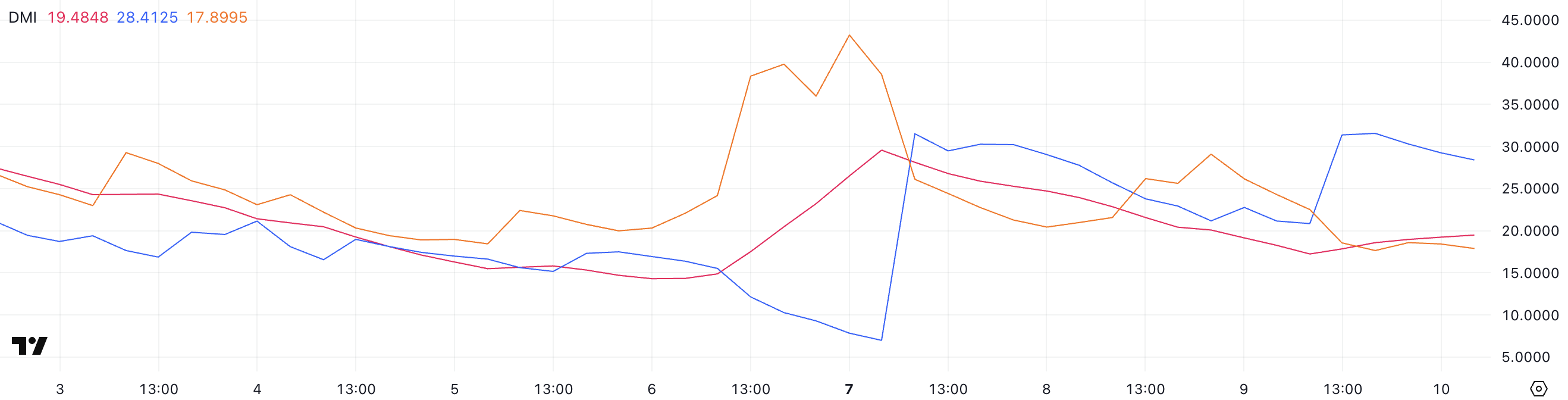Bitcoin’s Directional Movement Index (DMI) chart reveals a noticeable shift in momentum. The ADX (Average Directional Index), which measures the strength of a trend, has dropped to 19.48 from 29.56 just three days ago—indicating weakening trend intensity.