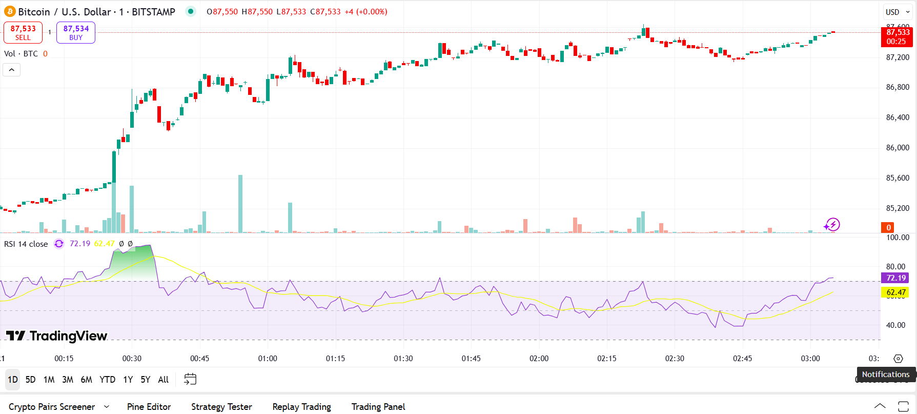 Gold hit a record $3,385, gaining nearly 2% in 24 hours, according to TradingView. Bitcoin also rallied, rising about 3% to $87,500. The token is up 4.5% over the past week.