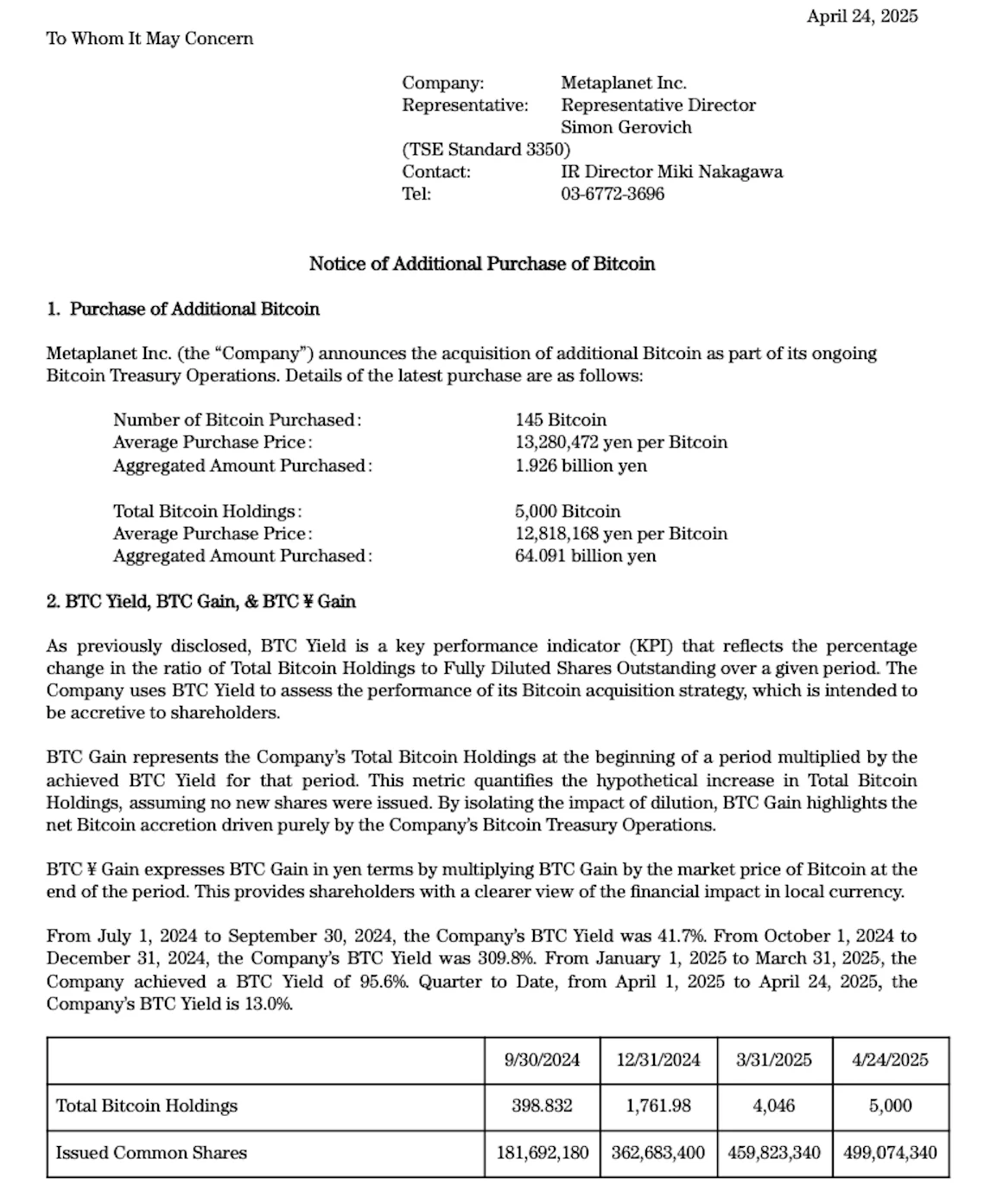 The Company uses Bitcoin Yield (BTC Yield) as a key performance indicator (KPI), assessing the increase in Bitcoin holdings relative to the fully diluted shares outstanding over a specific period.