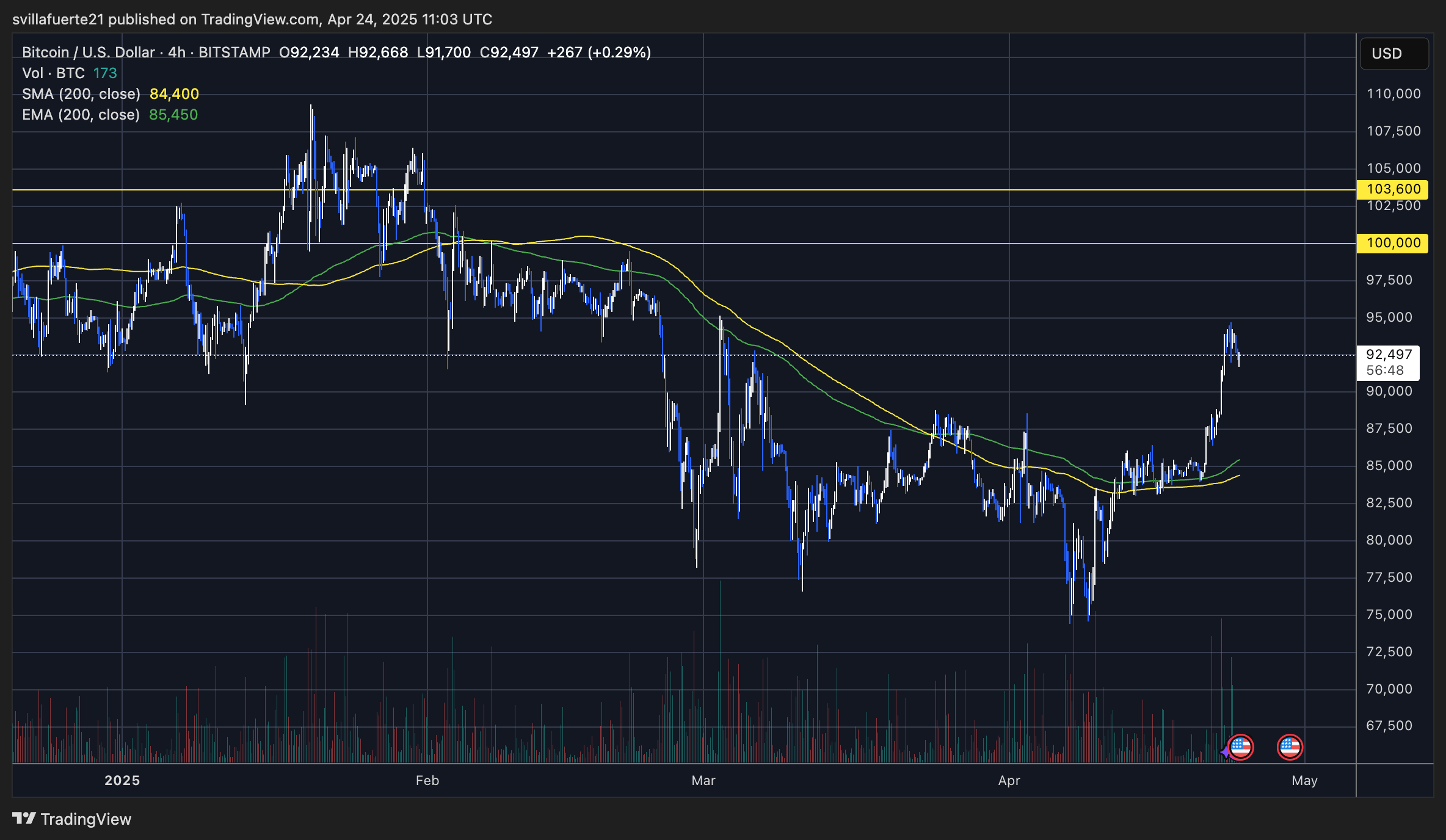 Bitcoin is trading at $92,500 after a strong move above the psychological $90K level, confirming bullish momentum in the short term. This breakout also marked a decisive close above the 4-hour 200 MA and EMA, both of which had acted as stiff resistance since January. Reclaiming these technical levels signals a potential shift in trend after months of selling pressure and sideways action.