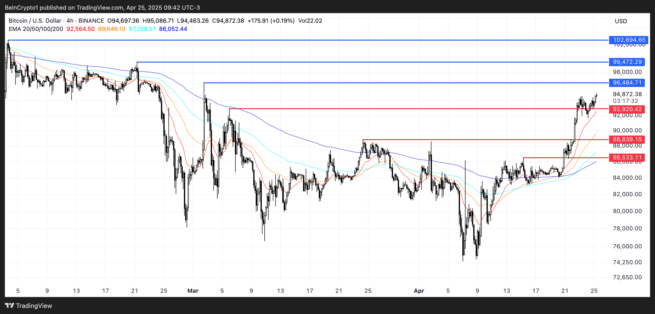 Bitcoin price could challenge key resistance levels at $96,484 and $99,472 if this momentum continues. A break above those could open the door for a push past the psychological $100,000 mark, with the next major target near $102,694—the highest level since early February.