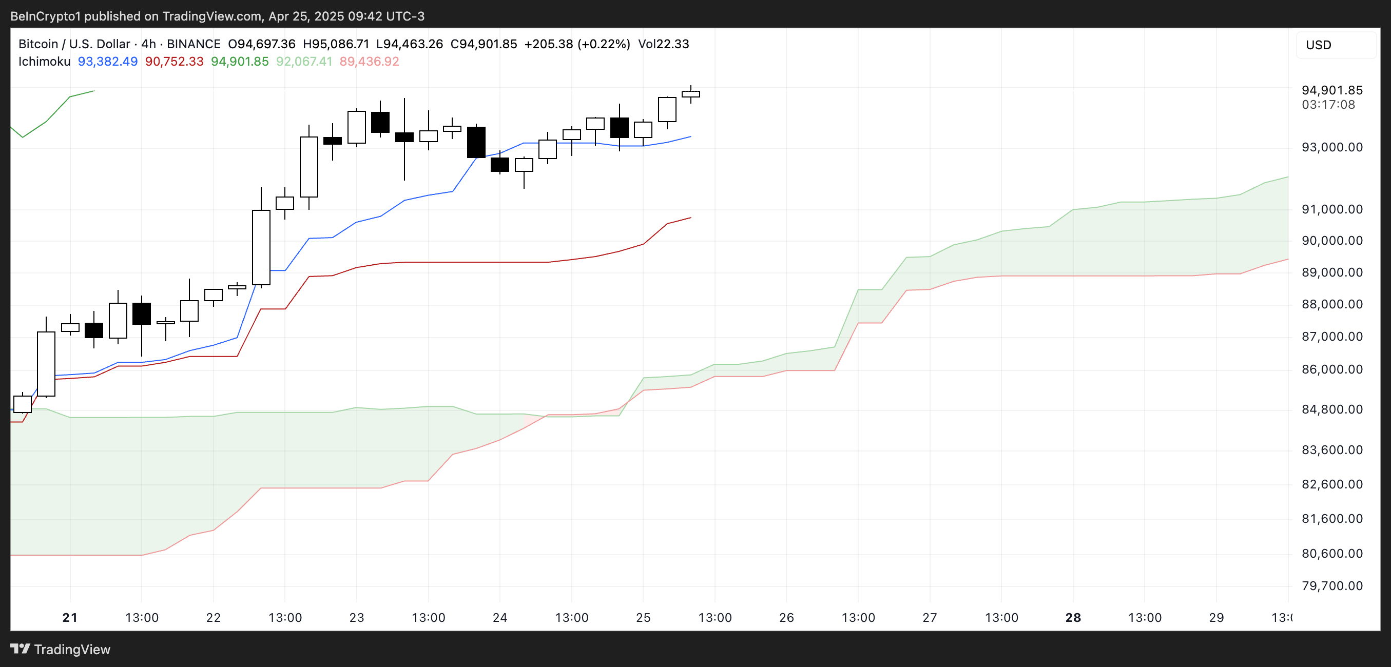 Bitcoin’s Ichimoku Cloud chart is showing signs of continued bullish momentum.