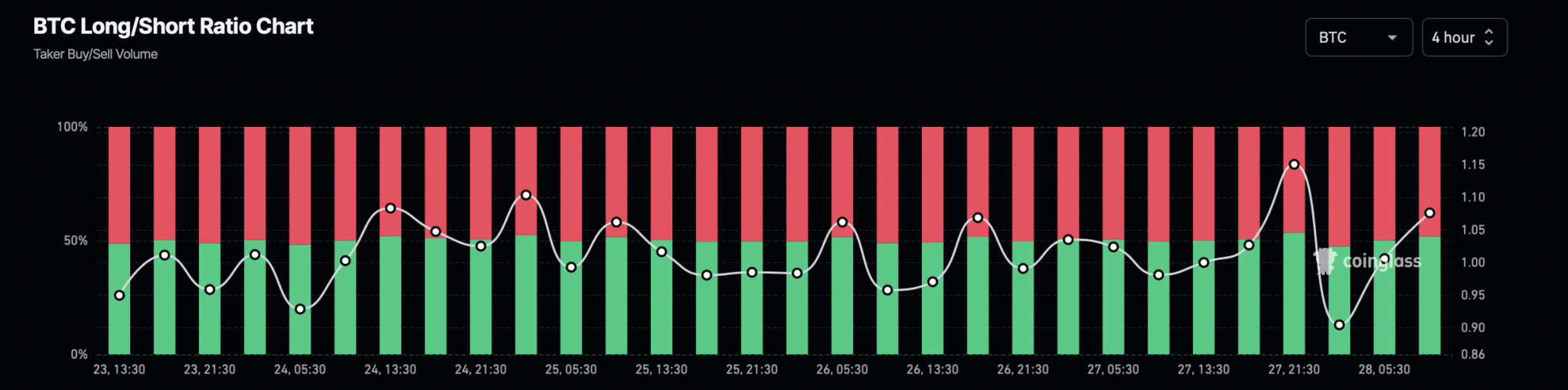 Over the past 8 hours, long positions in Bitcoin derivatives have significantly increased. According to Coinglass, long positions now account for 53.74%, boosting the long-to-short ratio to 1.16%.