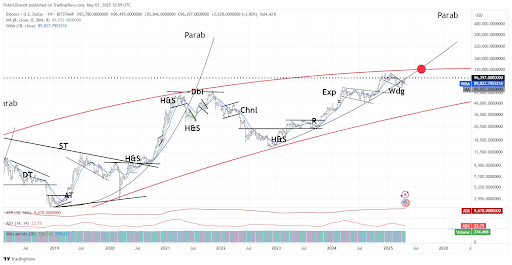Veteran trader Peter Brandt shared a weekly candlestick Bitcoin price chart on social media, highlighting a path toward $150,000 by late summer 2025. According to Brandt’s post on social media platform X, Bitcoin is currently trading below a parabolic trendline that is key to the final leg of the current bull cycle. Interestingly, this parabolic trendline has served as an upper resistance for Bitcoin’s price peaks and all-time highs since 2021.