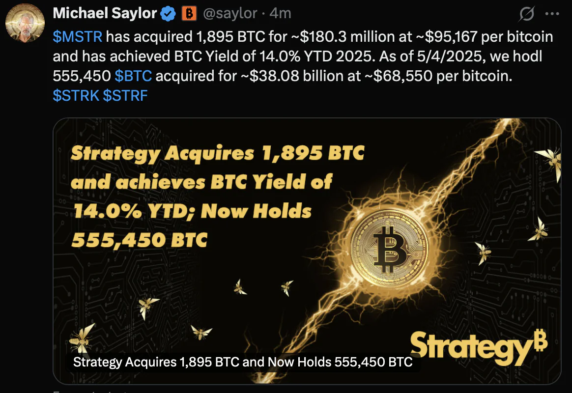 As of May 4, 2025, the company now holds a total of 555,450 Bitcoin, acquired for a total of $38.08 billion at an average price of $68,550 per Bitcoin.