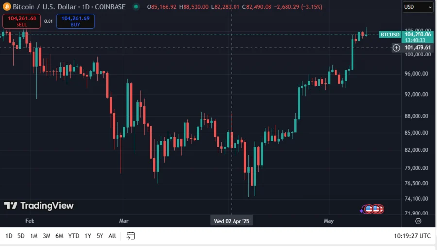 The crypto market has remained active as Bitcoin institutional confidence continues to rise. Metaplanet’s latest activity highlights BTC’s consistent accumulation by institutions. This acquisition happens at a time when Bitcoin keeps pushing its resilience, currently, its value standing at $104,560 after a 10.4% rise over the past week. Its trading volume also surged 23.60% from yesterday indicating increased participation from market users.