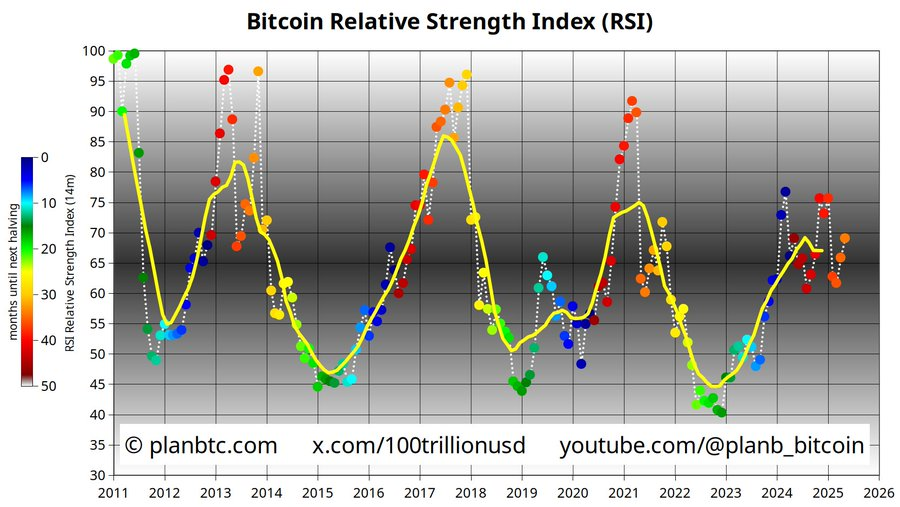 At present, Bitcoin’s RSI is 69, just under the 70 level, which is usually associated with overbought territory. Plan B expects Bitcoin to have at least four months with an RSI level above 80, mirroring the 2021, 2017, and 2013 bull market phases. When its RSI mark has passed 80, Bitcoin’s monthly returns have often exceeded 40%.