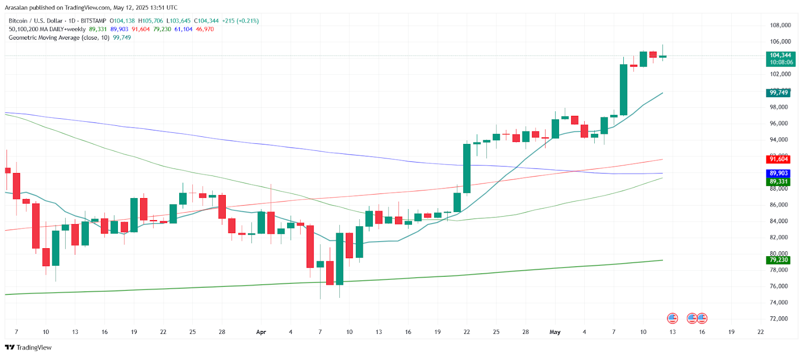 The 200-week moving average indicates a bullish stance as it pulls farther away from the geometric average. Historically, such a divergence has signaled the development of a bull market, suggesting that prices will surge. The distance between these moving averages strongly indicates that the market is entering a long-lasting bull period, which will push Bitcoin upward over the long run.