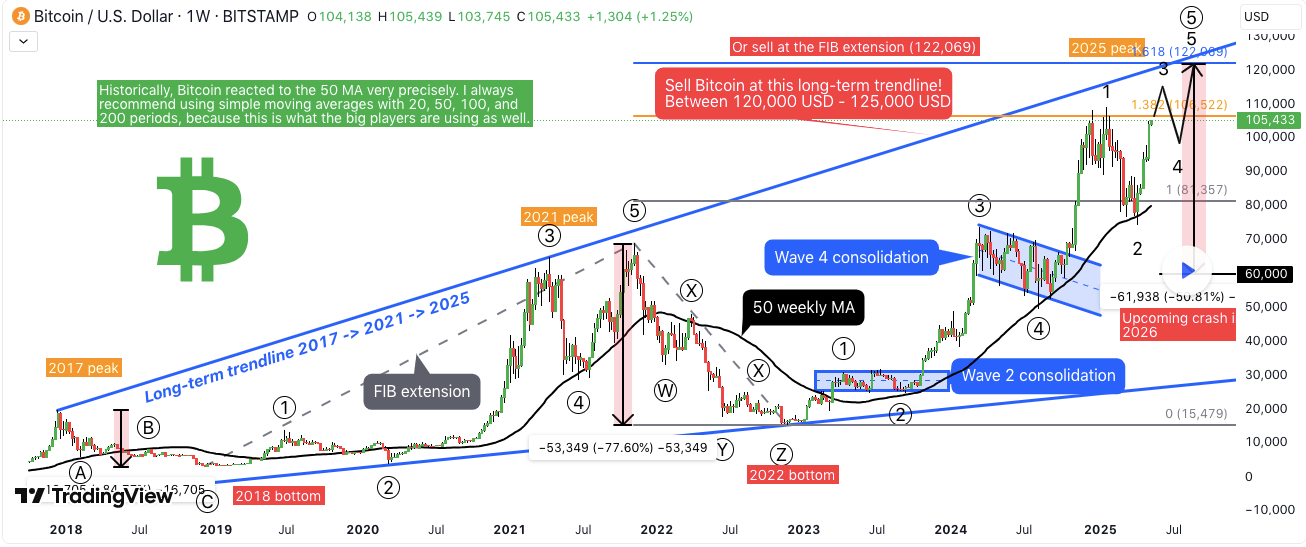 His target coincides with a historical trend line connecting Bitcoin’s 2017 and 2021 highs, forming a projected arc toward the 2025 peak. Xanrox warns that once Waves 4 and 5 conclude, the market could enter a bearish phase.