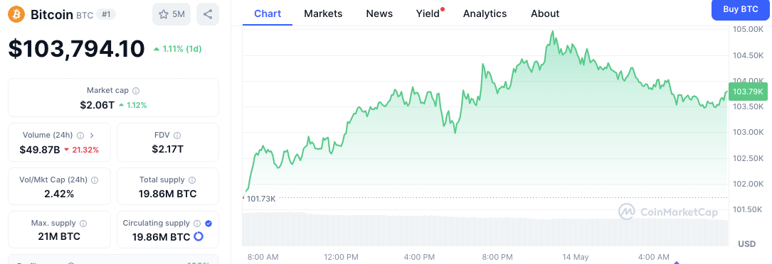 While equities rebounded on improved trade sentiment, Bitcoin maintained its upward trend. During the time of writing, Bitcoin traded at $103,794.10, marking a 1.11% increase over 24 hours. Its total market capitalization rose to $2.06 trillion, up 1.12% from the previous day.