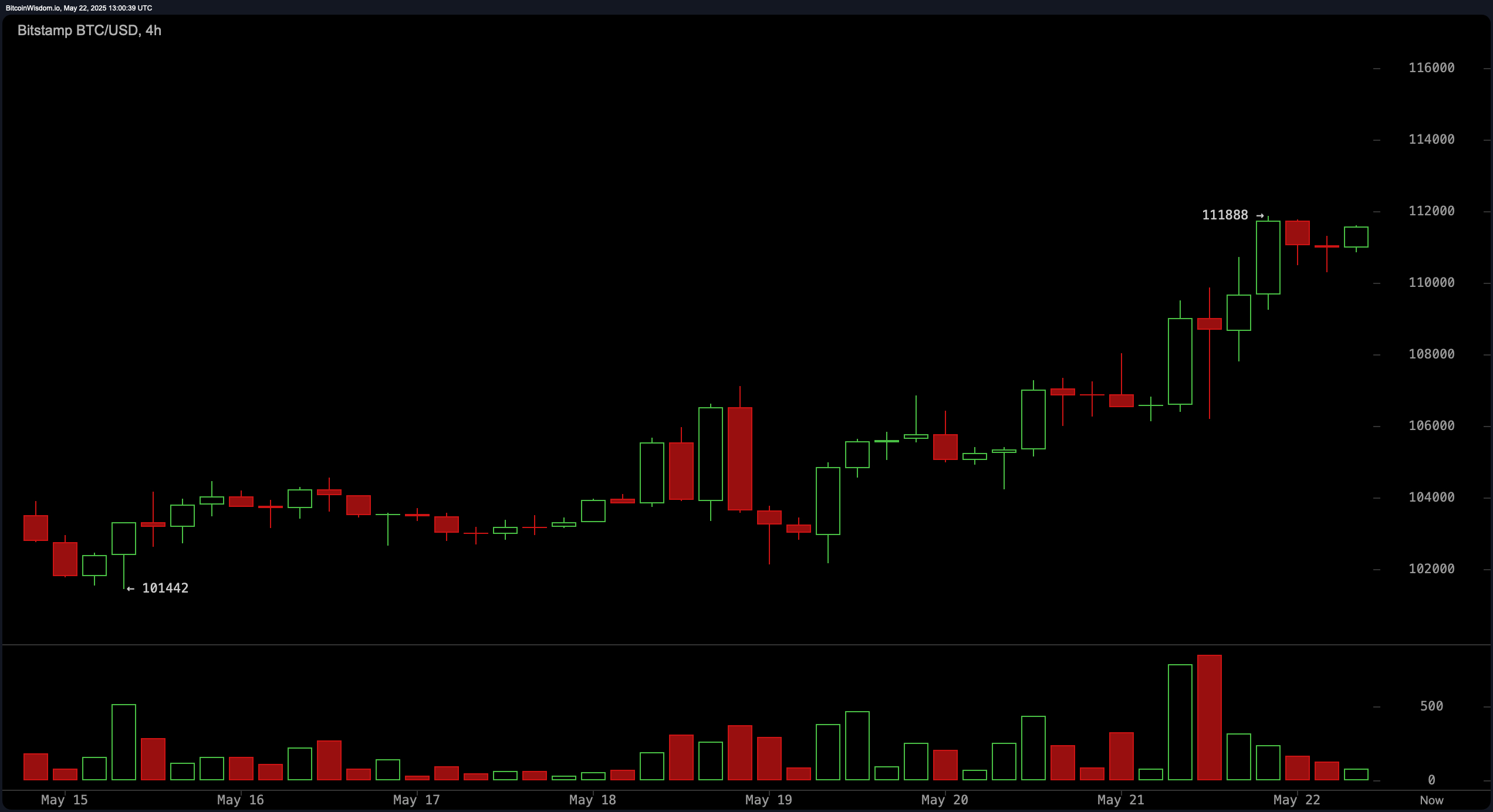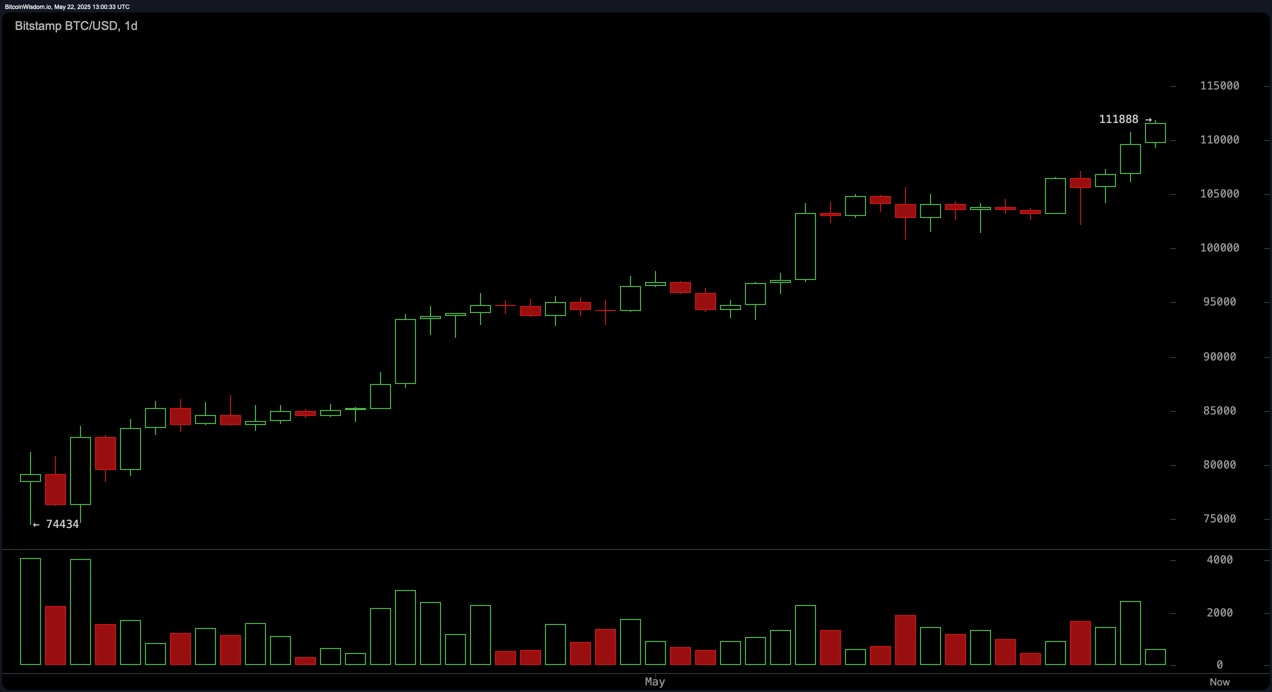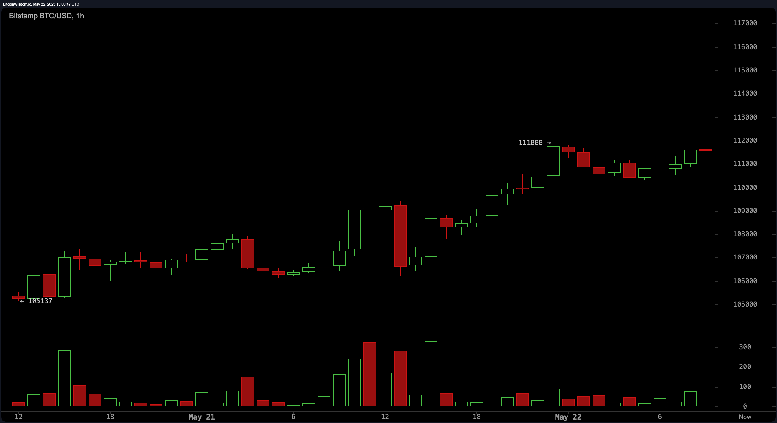 At 9 a.m. ET, bitcoin traded at $111,406 on May 22, 2025, brushing against its all-time high of $111,888, as the market showed broad signs of bullish momentum across hourly, 4-hour, and daily chart structures.