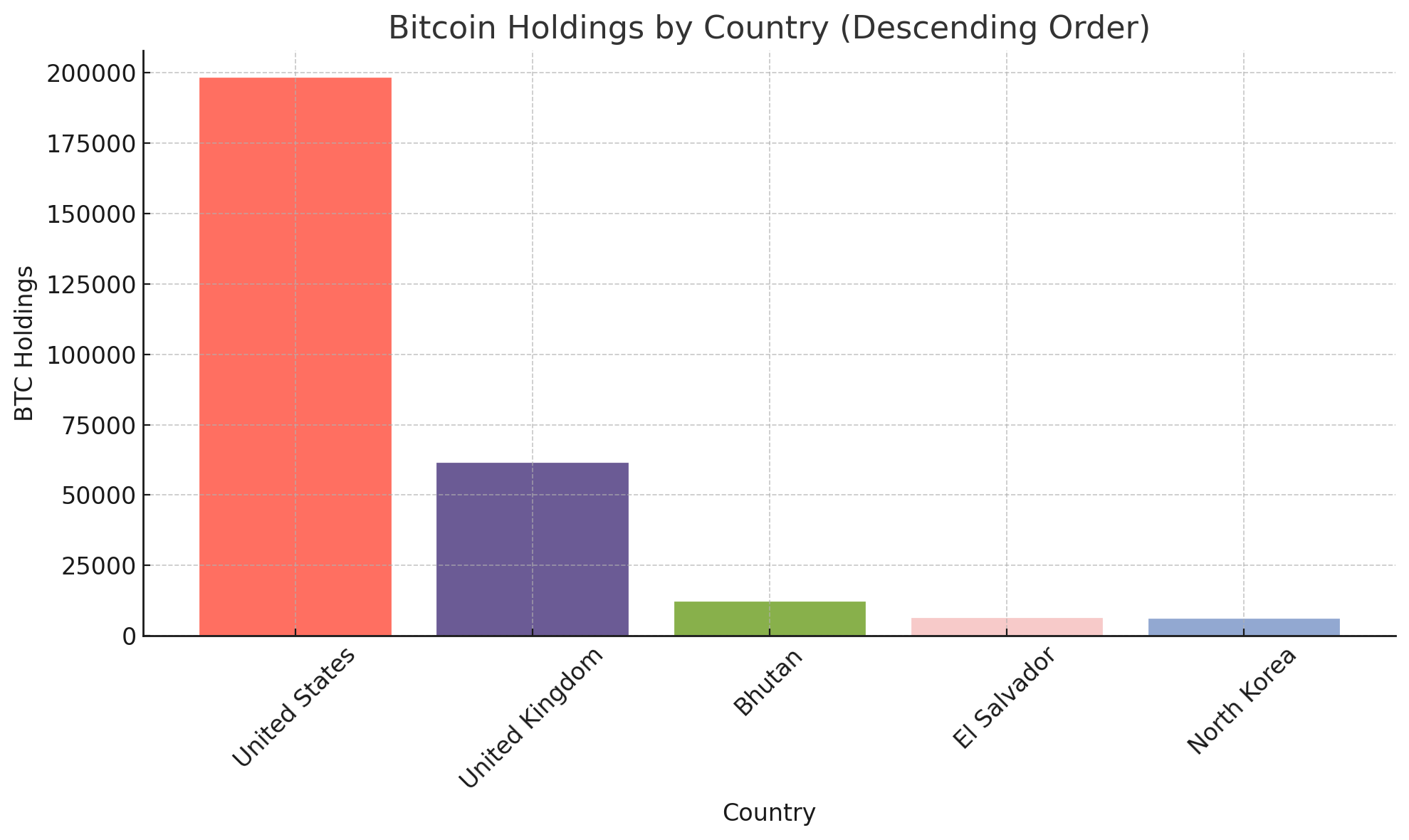 Leading the pack is the United States, with an estimated 198,012 BTC—valued at $21.72 billion at current market prices. The United Kingdom follows with a commanding reserve of 61,245 BTC, currently priced at $6.72 billion.