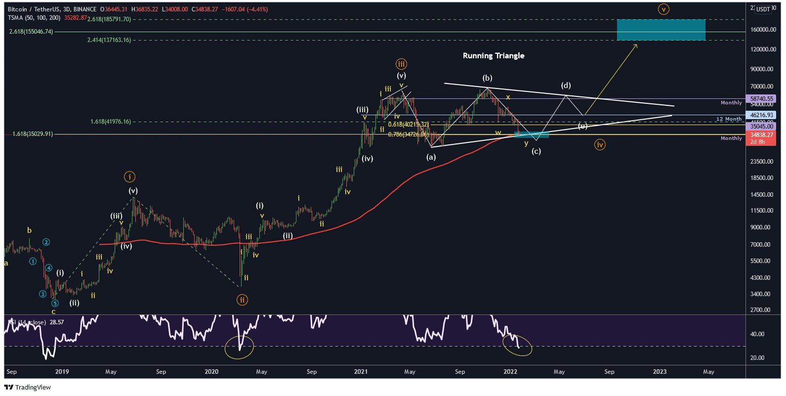 Cryptocurrency trader @24kCrypto posted a BTC chart, in which the price is completing a long-term fourth wave triangle. He also indicated that the RSI has given a bullish signal that previously occurred during the March 2020 bottom.