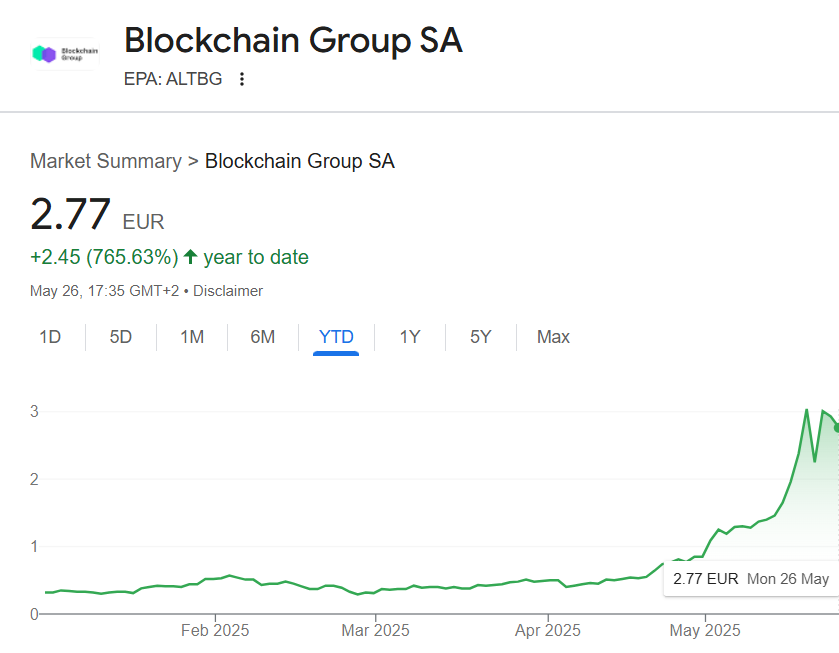 Blockchain Group, an Euronext-listed company, announced a new bond valued at €63.3M ($72M) with plans to acquire more BTC. The company is the next public entity to pursue a leveraged strategy of building a BTC treasury. Following the announcement, ALTBG shares traded at $3.15 (€2.77), near their highest price for the year to date.