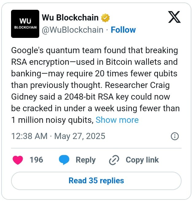 - The latest research report has reduced the number of qubits required to crack the RSA encryption used in Bitcoin wallets to around 1 million.