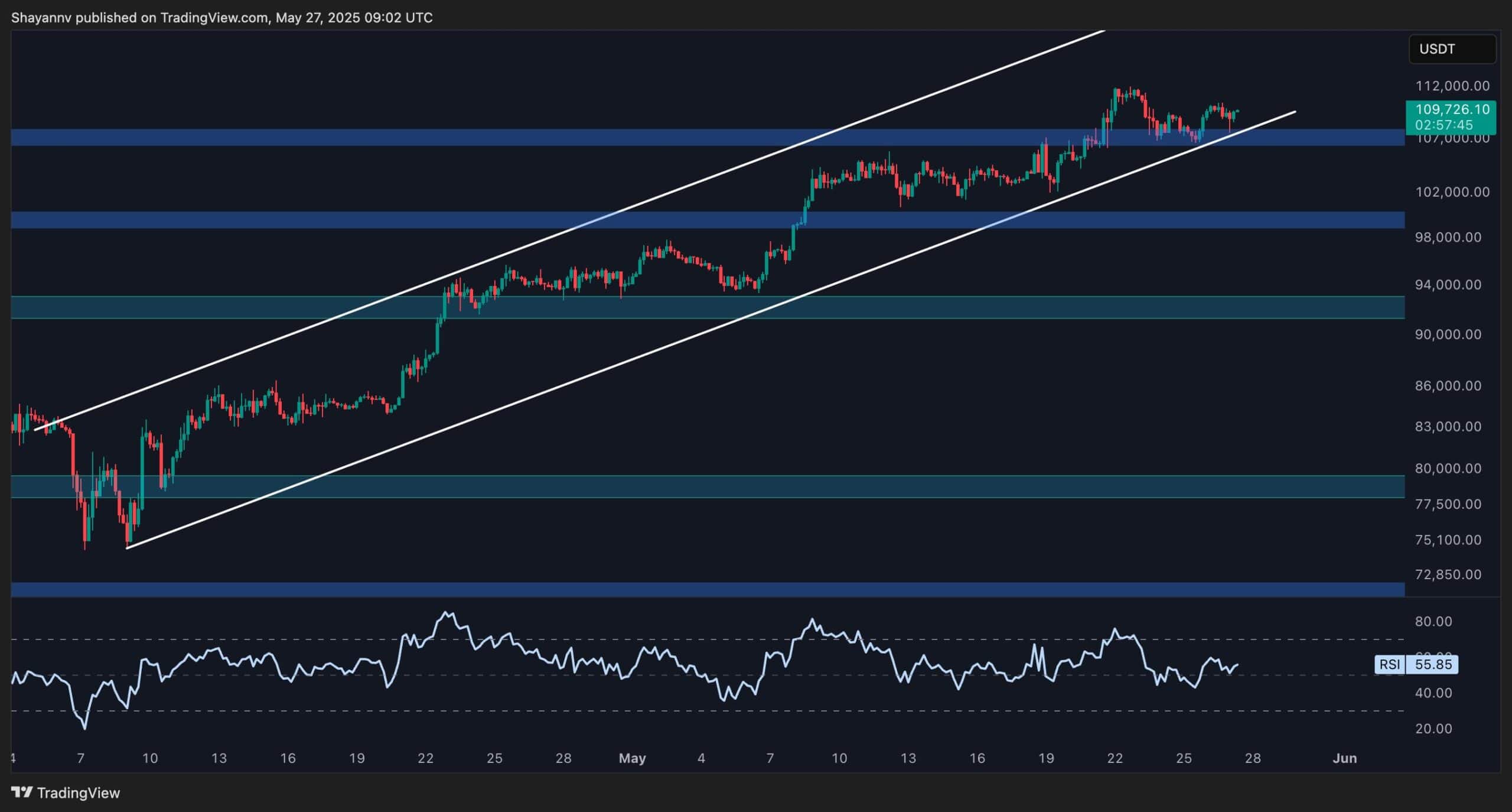 Bitcoin is currently navigating through a consolidation phase beneath its recently established all-time high of $111K, indicating a slowdown in bullish momentum following the breakout above the former ATH at $109K.