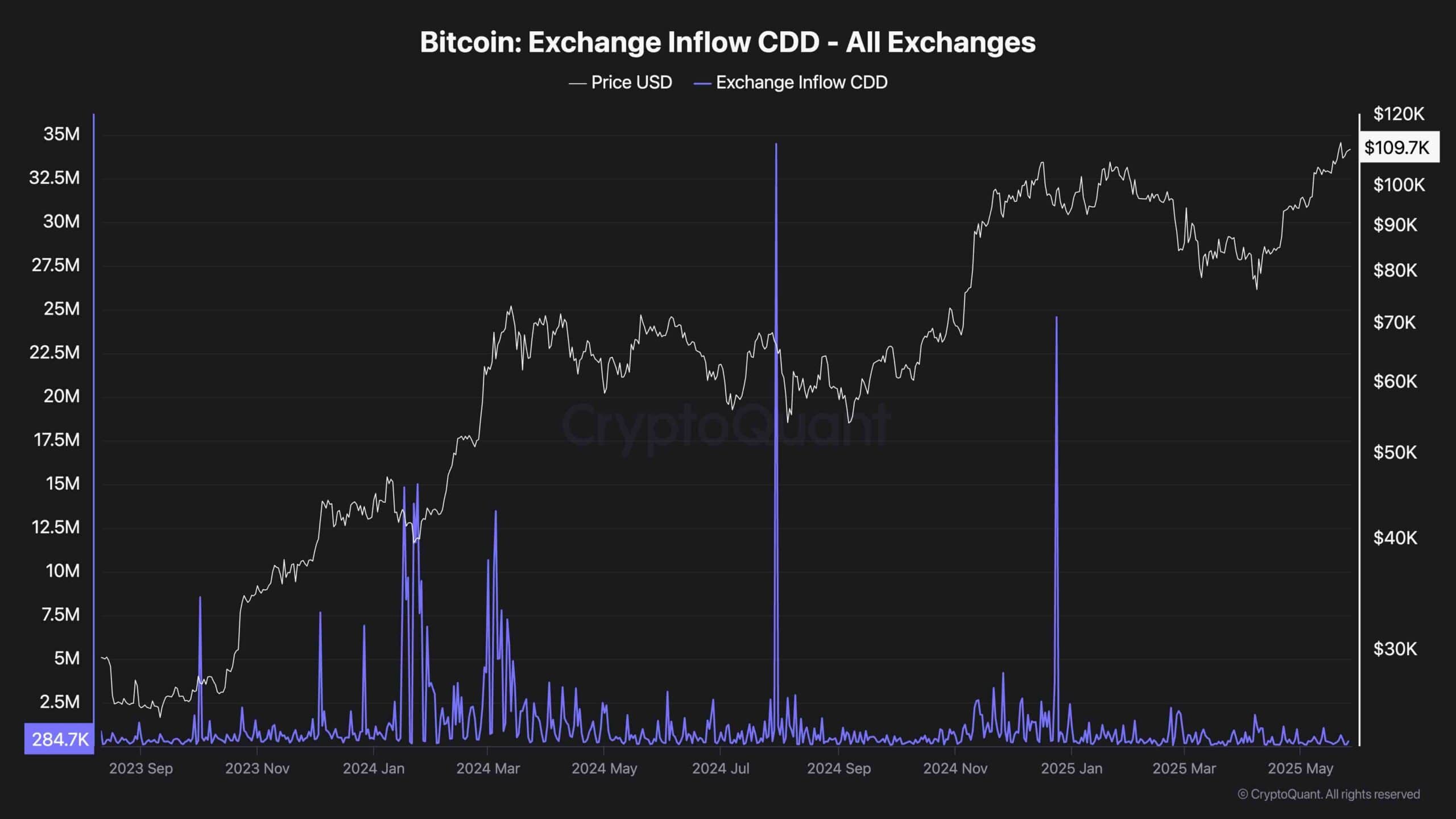 Historically, each major peak in Bitcoin’s price during previous bullish cycles has been accompanied by sharp spikes in this metric, reflecting the movement of long-dormant coins to exchanges, often signaling that long-term holders are offloading their assets.