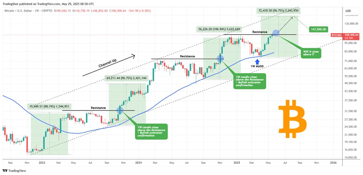 So far in May, Bitcoin has broken above its prior January 2025 resistance, setting a fresh all-time high in the process. But as of now, the weekly candle has yet to close decisively above the resistance line. That technical milestone is key: “If we get that weekly close,” TradingShot wrote, “we can expect a minimum 96.75% move from the bottom,” which would place the next target around $147,000.
