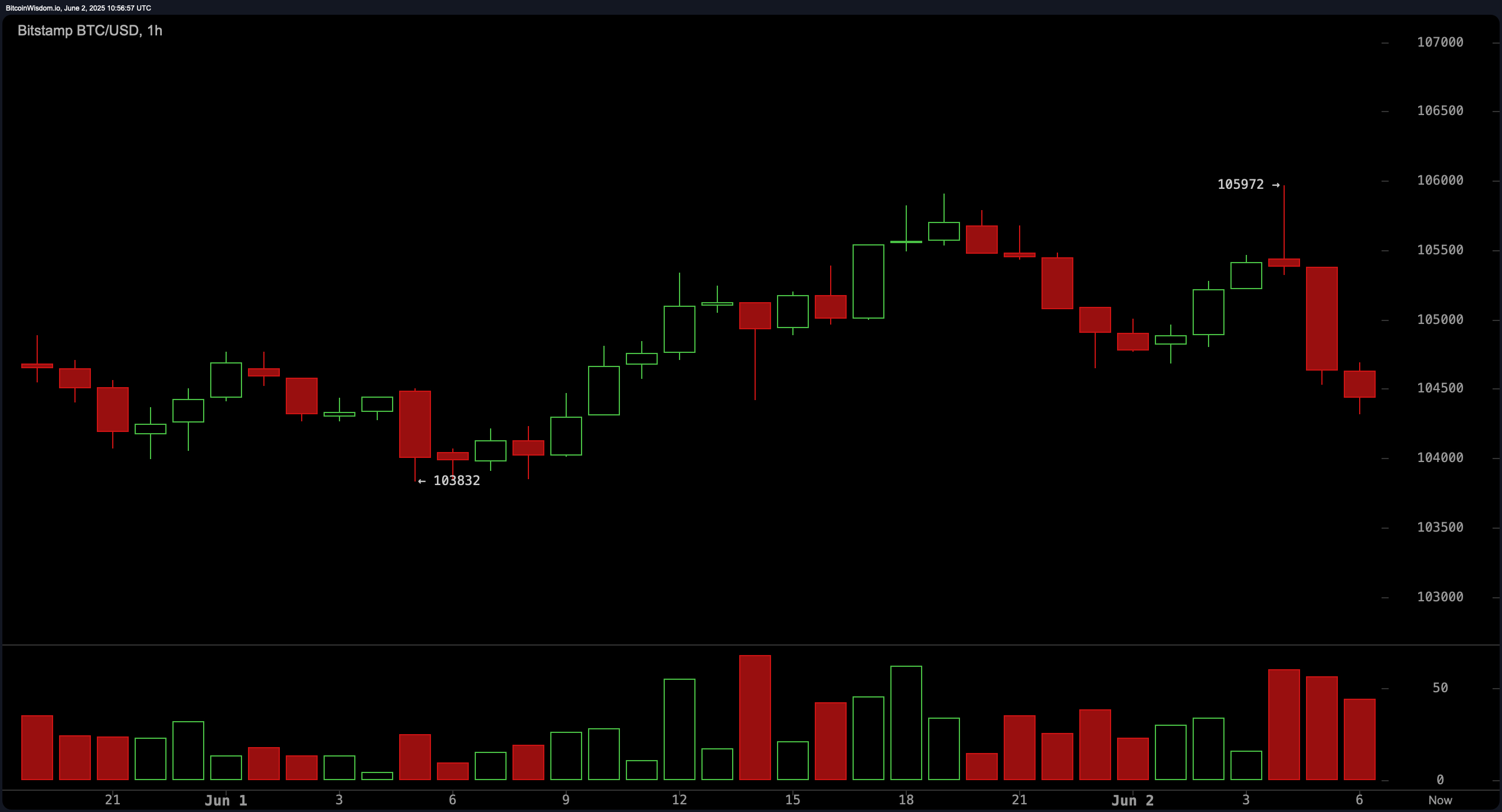 Bitcoin traded at $104,391 on June 2, 2025, with a market capitalization of $2.074 trillion and a 24-hour trading volume of $20.70 billion. The intraday price fluctuated between $103,939 and $105,804, revealing a tight consolidation range after a pullback from recent highs.