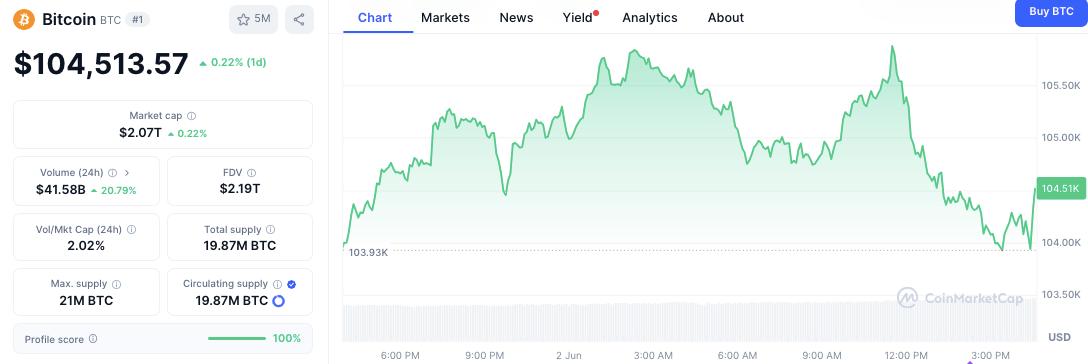 The timing of the acquisitions coincides with heightened trading activity in the Bitcoin market. Data from CoinMarketCap shows that Bitcoin was trading at $104,513.57 at the time of writing, representing a 0.22% increase over the past 24 hours. Trading volume rose by 20.79% during the same period, reaching $41.58 billion, indicating increased market participation.