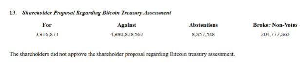 However, the shareholder vote reflects broad institutional resistance to crypto-based treasury diversification.