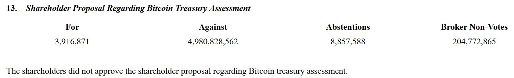 The bitcoin-related proposal drew notable attention, as it mirrored similar efforts presented at other major tech firms. Despite increasing discourse on cryptocurrency in corporate finance, Meta shareholders decisively rejected the idea. Less than 0.1% voted in favor, with 95% voting against and approximately 8.9 million shares abstaining. Vaneck’s head of digital assets research, Matthew Sigel, commented on Meta’s vote on social media platform X: