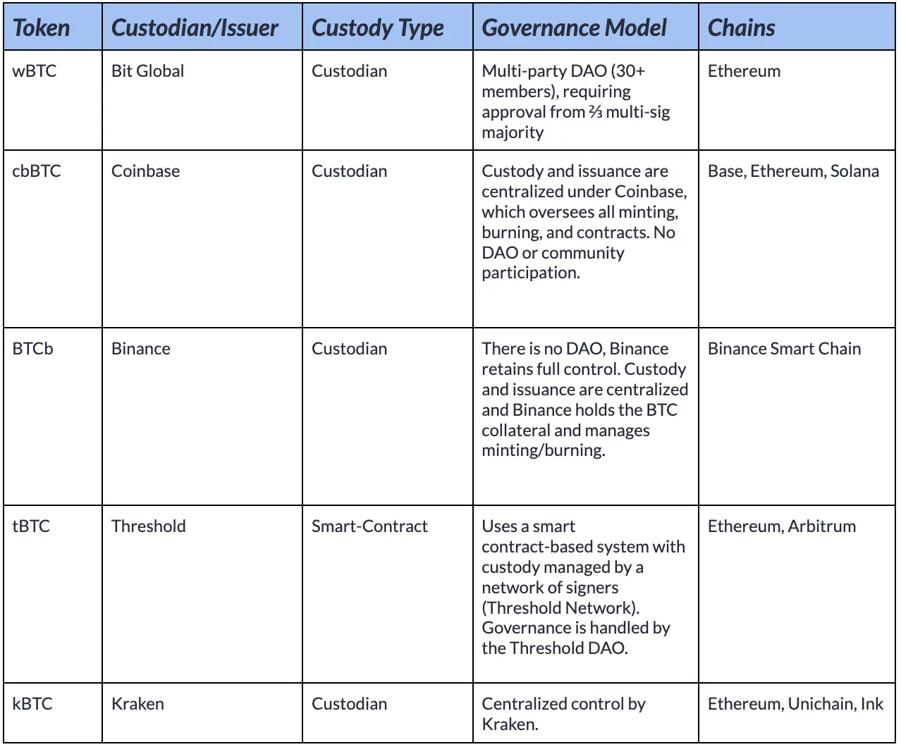 These types of tokens employ varying custody and governance models, Coin Metrics notes. WBTC uses a multi-party DAO, while cbBTC is centrally managed by Coinbase. Threshold’s tBTC represents a decentralized, smart-contract-based alternative. Despite differing trust assumptions, users relinquish custody of native BTC for tokenized versions usable elsewhere.