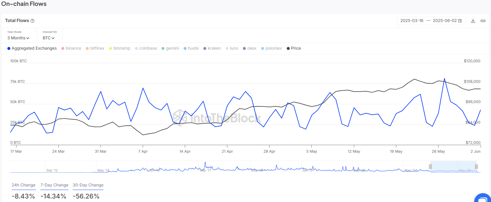 Over the past 30 days, the net flow of Bitcoin to exchanges dropped by 56.26%. The 7-day and 24-hour periods also showed similar declines of 14.34% and 8.43% respectively.