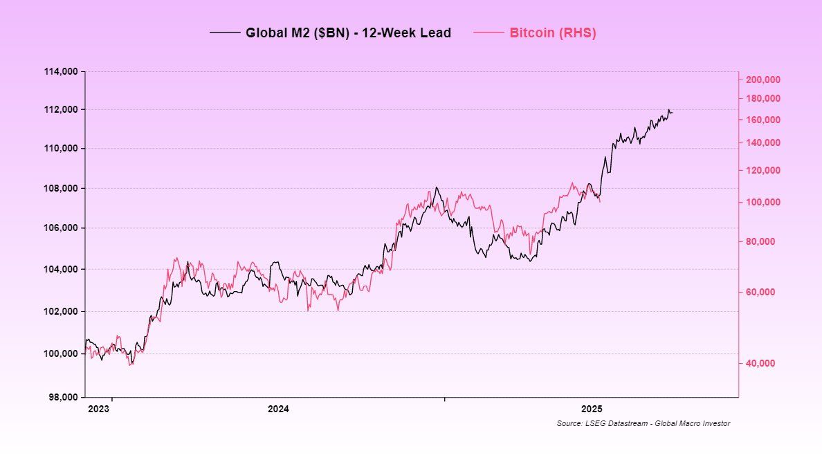 The chart shows that Bitcoin typically follows M2 growth with a 12-week lag. Pal emphasized that investors shouldn’t expect every short-term movement to match perfectly. What matters more is the overall context.